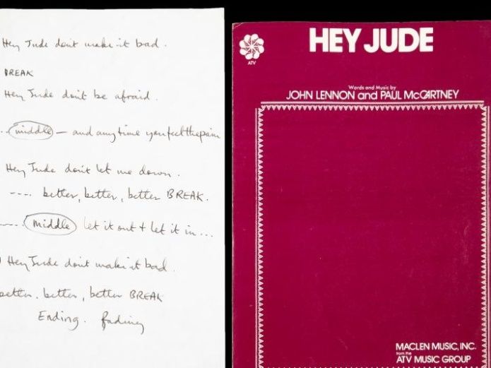 La letra original de Hey Jude escrita a mano en 1968 por Paul McCartney ha sido subastada en Nueva York por nueve veces más su precio estimado.