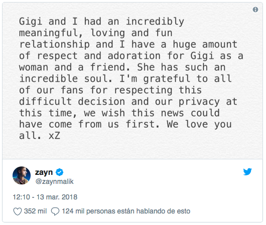 "Gigi y yo tuvimos una increíblemente significativa, amorosa y divertida relación y tengo un gran respeto y adoración por Gigi como mujer. Tiene un alma increíble. Estoy agradecido con todos nuestros fans por respetar esta difícil decisión y nuestra privacidad en este momento. Desearíamos que la noticia hubiera salido de nosotros primero. Los amamos a todos", escribió el cantante.